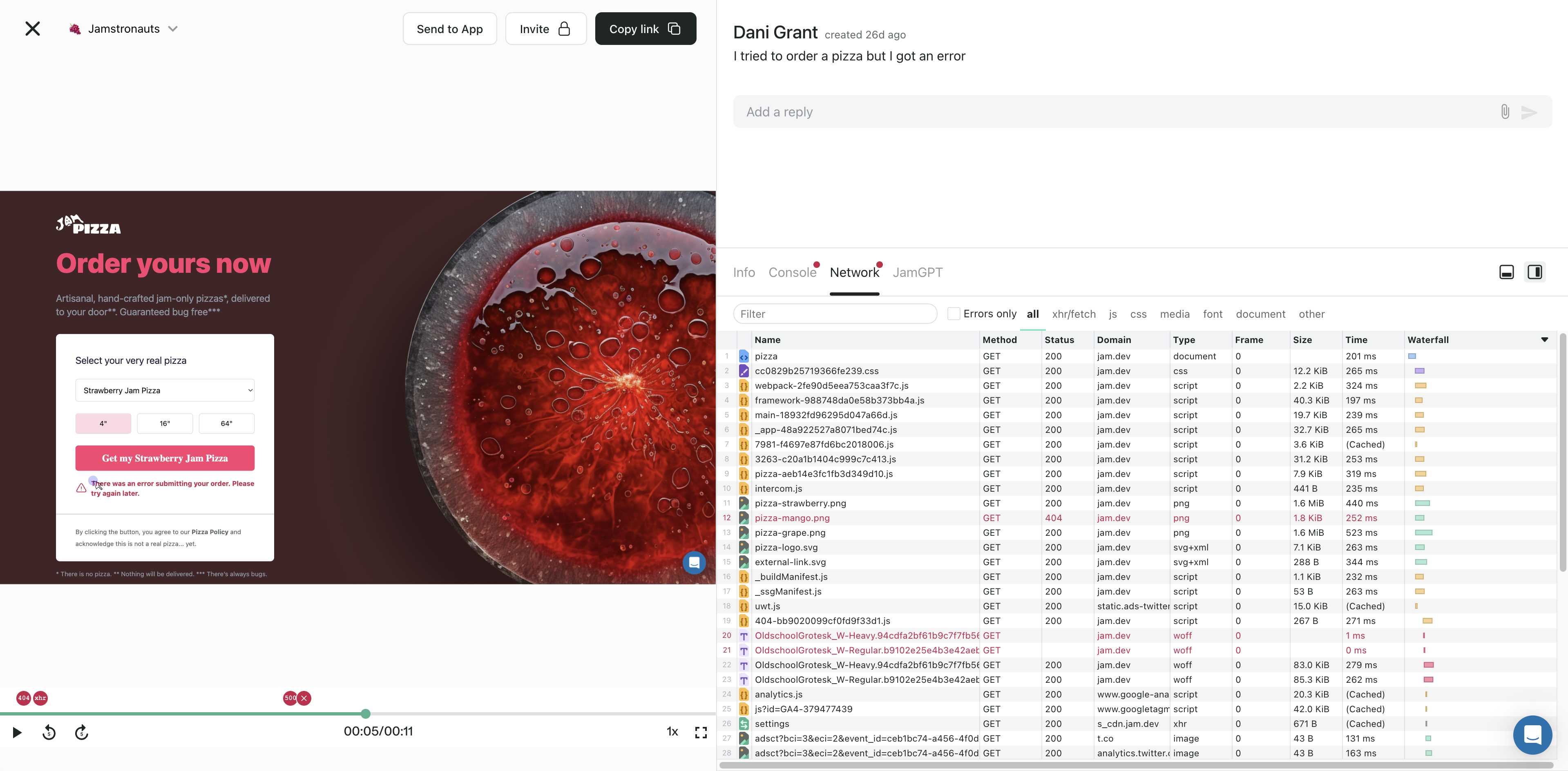 For context, Jam is a Browser Extension which lets PMs, QAs, support, etc., quickly report bugs to their issue tracker, for their engineering team. Then, when an engineer views a bug on Jam, they see the console logs, network requests, and a video, screenshot, or session replay. We call the eng-specific part of our app the "devtools". My goal is to, with 6 weeks of our engineering team's time, improve the experience of engineers using devtools as much as I can.