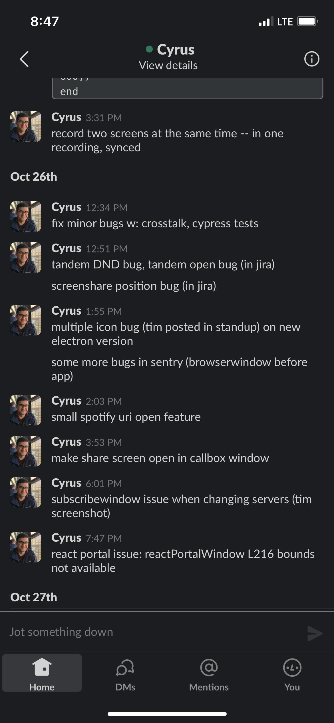 When I'm working, and get a non-urgent task that would otherwise interrupt me, it goes in my Slack DMs. This is what it looks like: